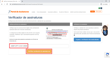 Após ter o Código de Verificação, digite ou cole o no campo conforme imagem e clique em “Verificar protocolo de assinaturas”