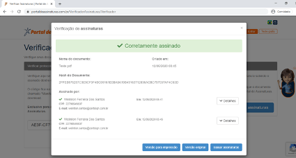 Em seguida será apresentada a tela de Verificação de Assinaturas, onde além de verificar se a assinatura esta OK, também é possível baixar uma versão para impressão, baixar o documento original e o documento assinado.