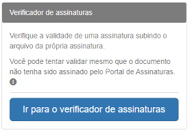 Para acessar o verificador, acesse este link ou acesse a página inicial do Portal de Assinaturas e clique em VERIFICADOR DE ASSINATURAS, em seguida em “Ir para o verificador de assinaturas”.