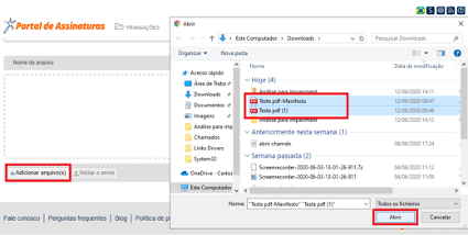 Em seguida clique em “Adicionar arquivo(s)”, selecione os documentos assinados e clique em Abrir.