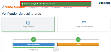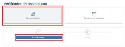 Para verificar o documento utilize a opção “Carregar assinatura” e clique em “Enviar assinatura”.